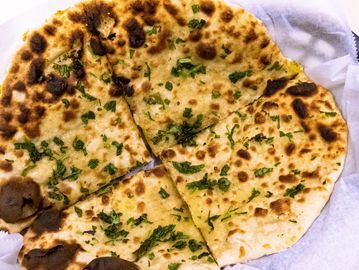 Indian whole wheat bread filled with spiced potatoes and baked in a tandoori oven.