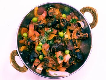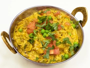 Tender tandoori roasted eggplant cooked with peas, cream, and spices.