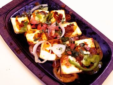 Homemade cheese sautéed with onions, carrots, bell peppers and spices served on a sizzling platter.