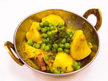 Potatoes and green peas cooked with spices.