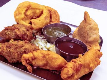 Combination of vegetable samosa, chicken pakora, onion bajji and vegetable pakora.