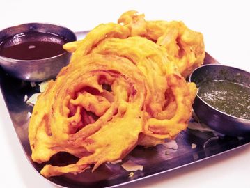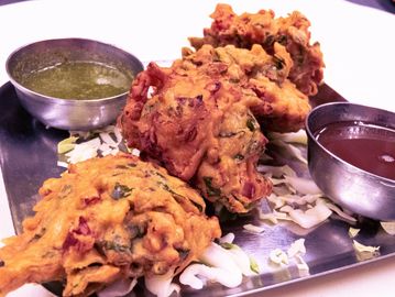Seasoned onions dipped in lentil flour and deep fried.