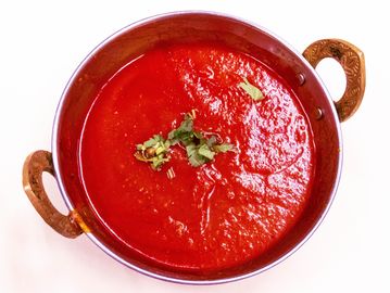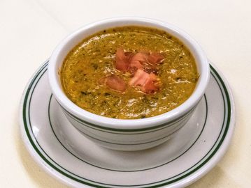 Soup made with spinach, tomatoes, onions, cream, and mild spices.