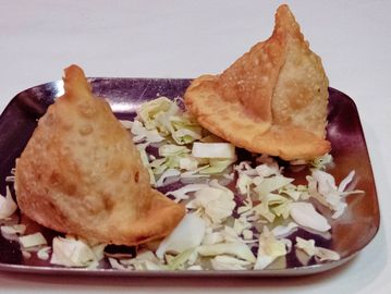 Vegetable Samosa: Deep fried pastry dough stuffed with seasoned potatoes and peas.